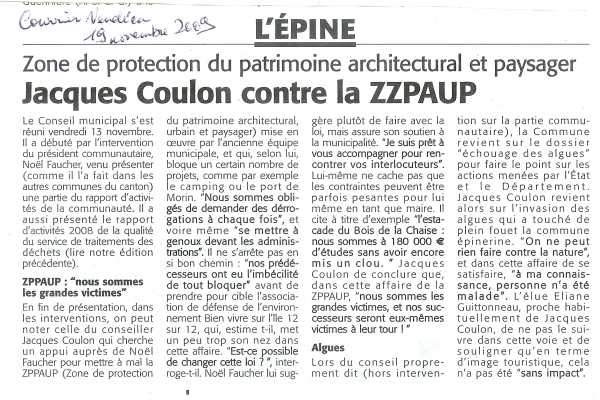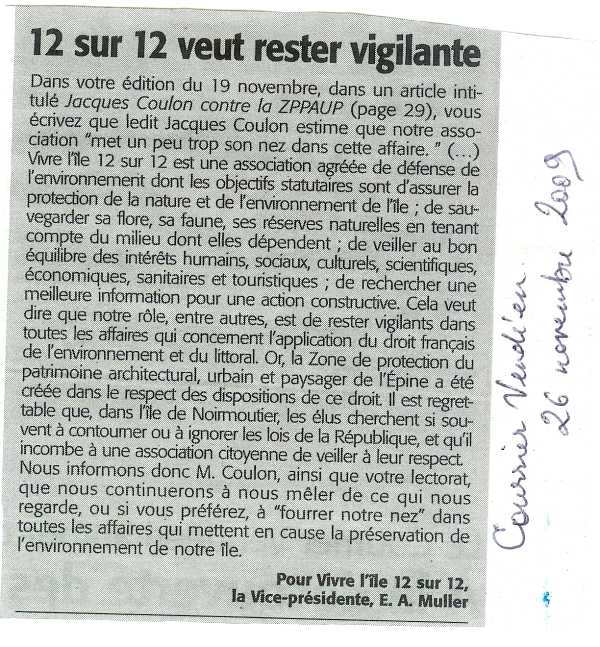 Dans le dernier numéro de l’ “Avenir de l’île de Noirmoutier“, feuille consacrée à la promotion de l’ex-sénateur Jacques Oudin, une “Madame B. résidente à l’Épine“ écrit à propos de la maison des Thibaudières :