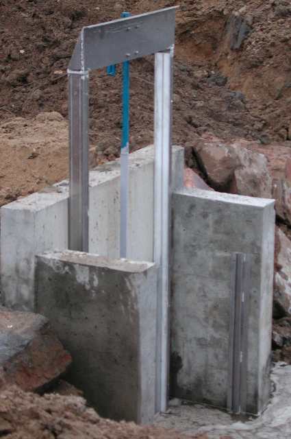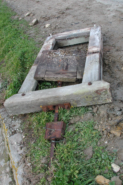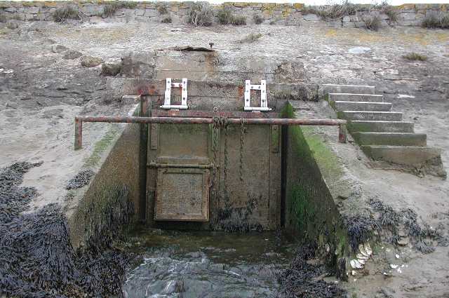 En cas de danger, des madriers en métal (fonte ?) seraient insérés dans les rainures visibles sur les poteaux de soutien verticaux. Une semelle horizontale partiellement ensablée existe.